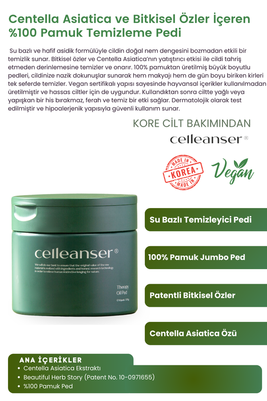 CELLEANSER Centella Asiatica içeren %100 Pamuktan yapılmış Nemlendirici Temizleme Pedi Therapy Oil Pad