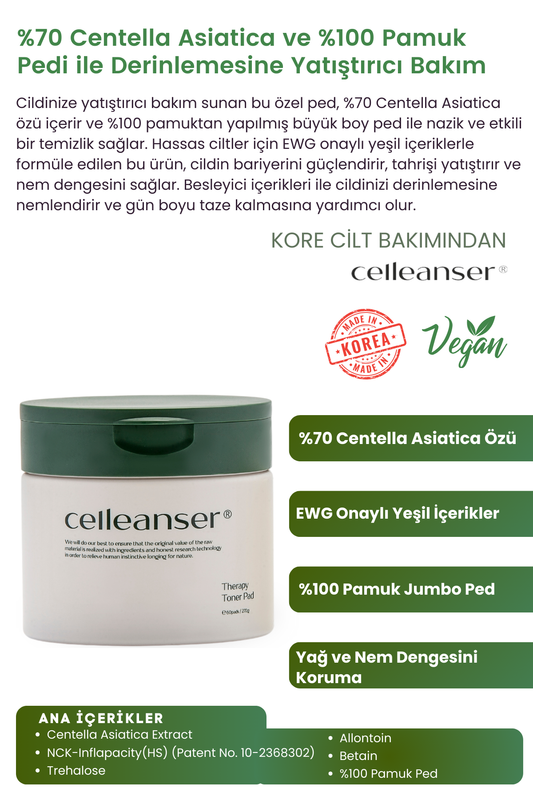 CELLEANSER Centella Asiatica Içeren %100 Pamuktan Yapılmış Nemlendirici Temizleme Pedi Therapy Toner Pad